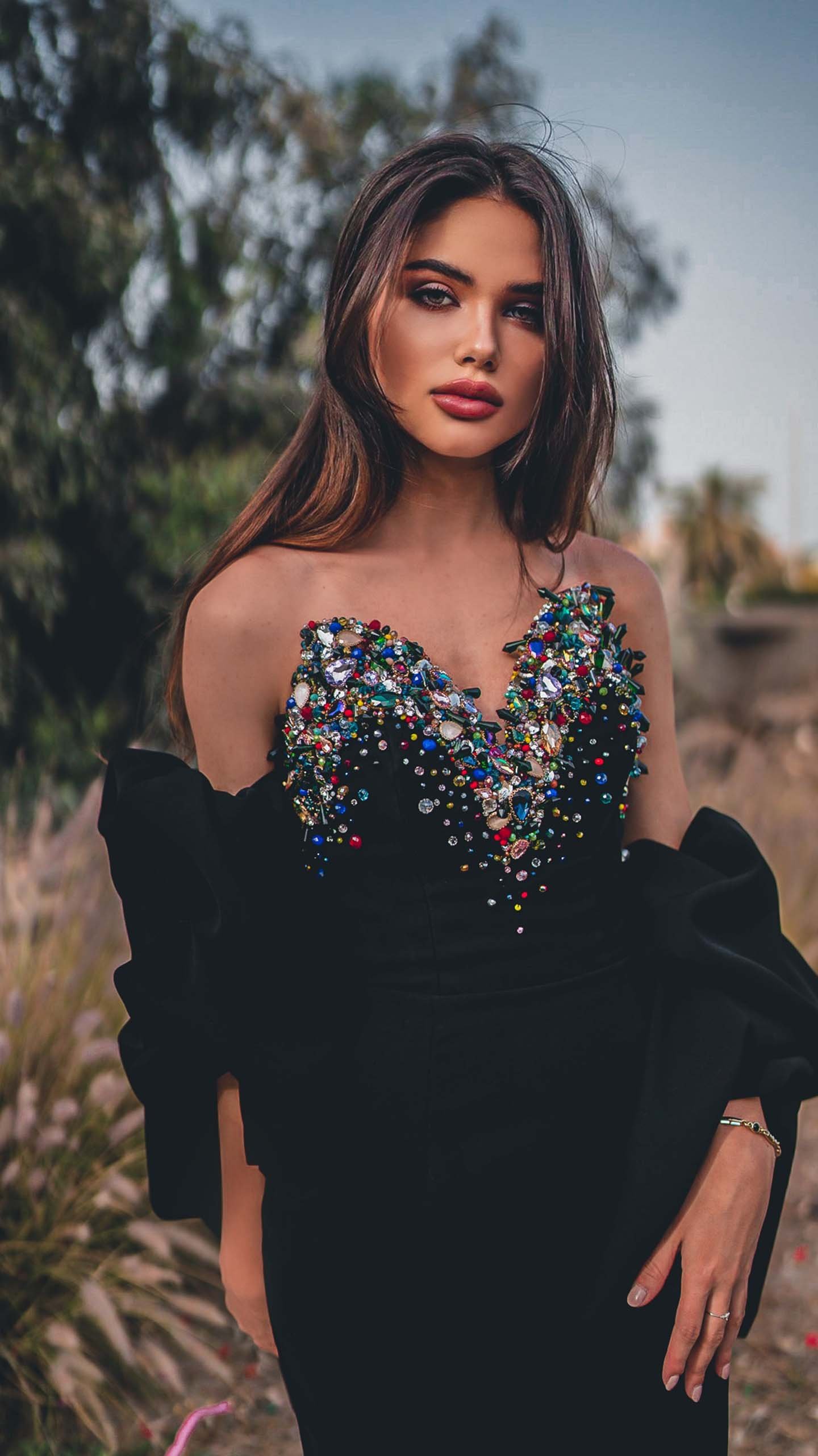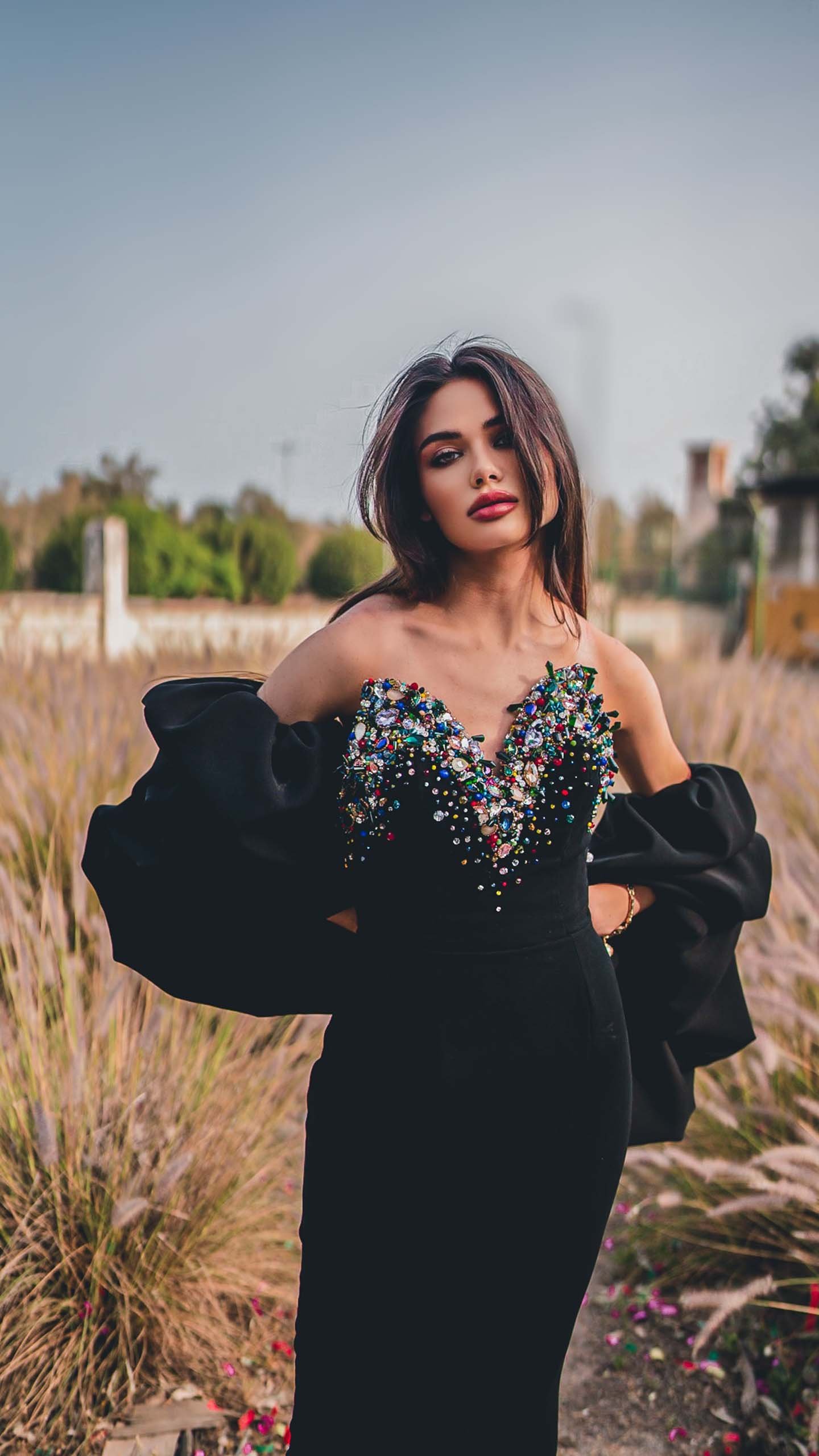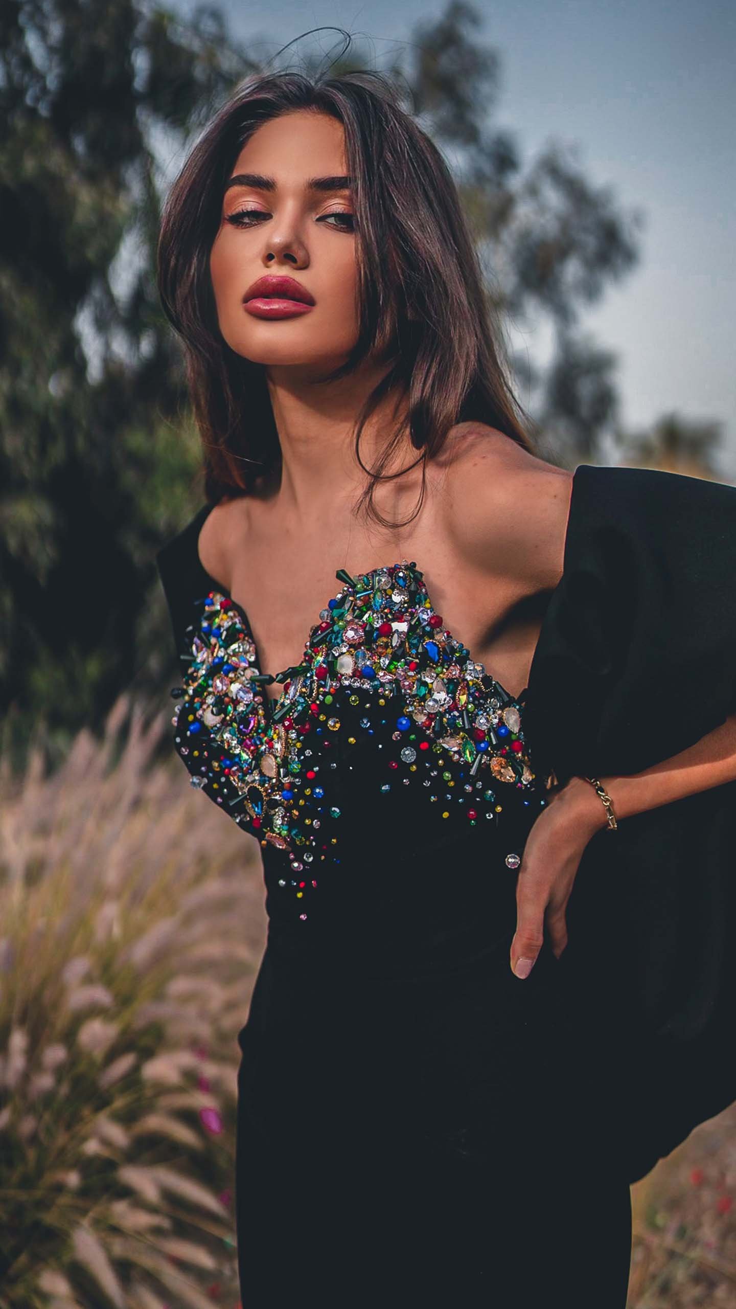 An elegant black Barbie crepe dress adorned with colorful stones that add a touch of sparkle and allure, complemented by a stylish Cape for a sophisticated and distinctive look.