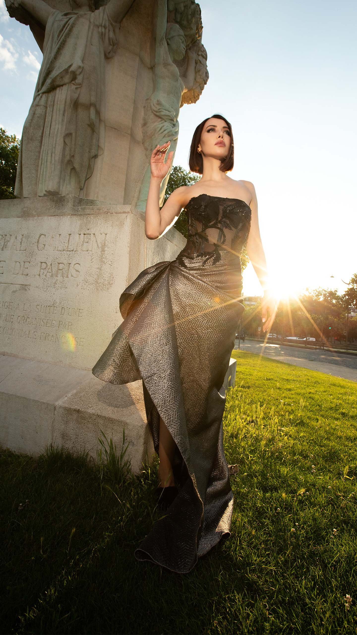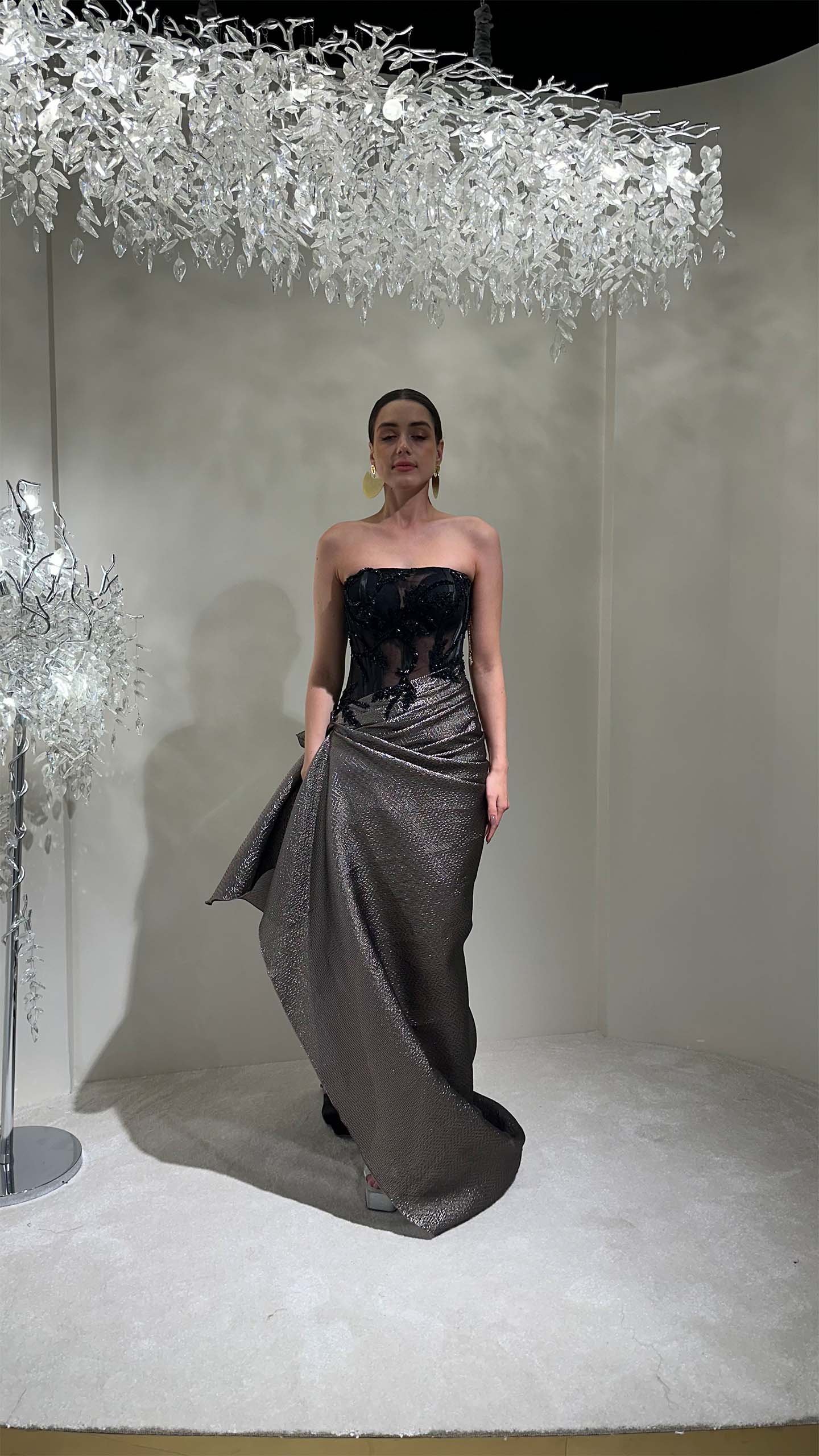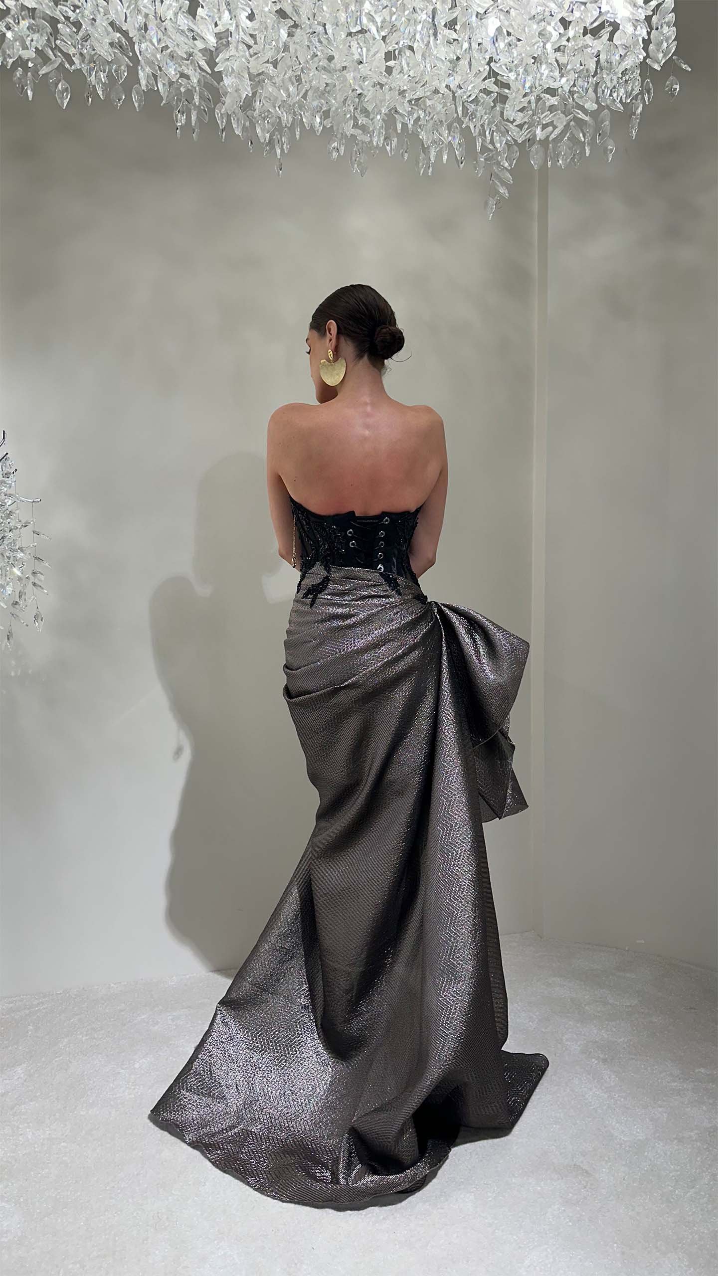 An exquisite dress crafted from metallic fabric, featuring a striking corset adorned with handcrafted black embellishments, adding a touch of elegance. The design accentuates the silhouette with grace and luxury.